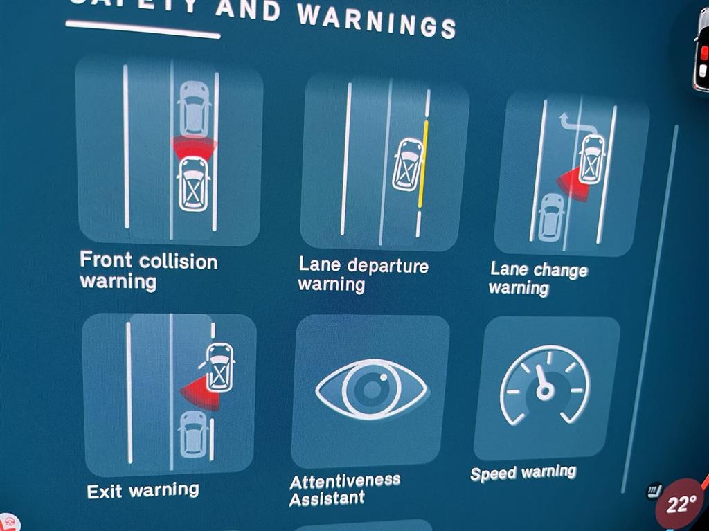, automatisk nødbremsesystem, blindvinkelsassistent, vognbaneassistent, automatisk nødassistent, auto hold, esp, antispin, dæktryksmåler, skiltegenkendelse