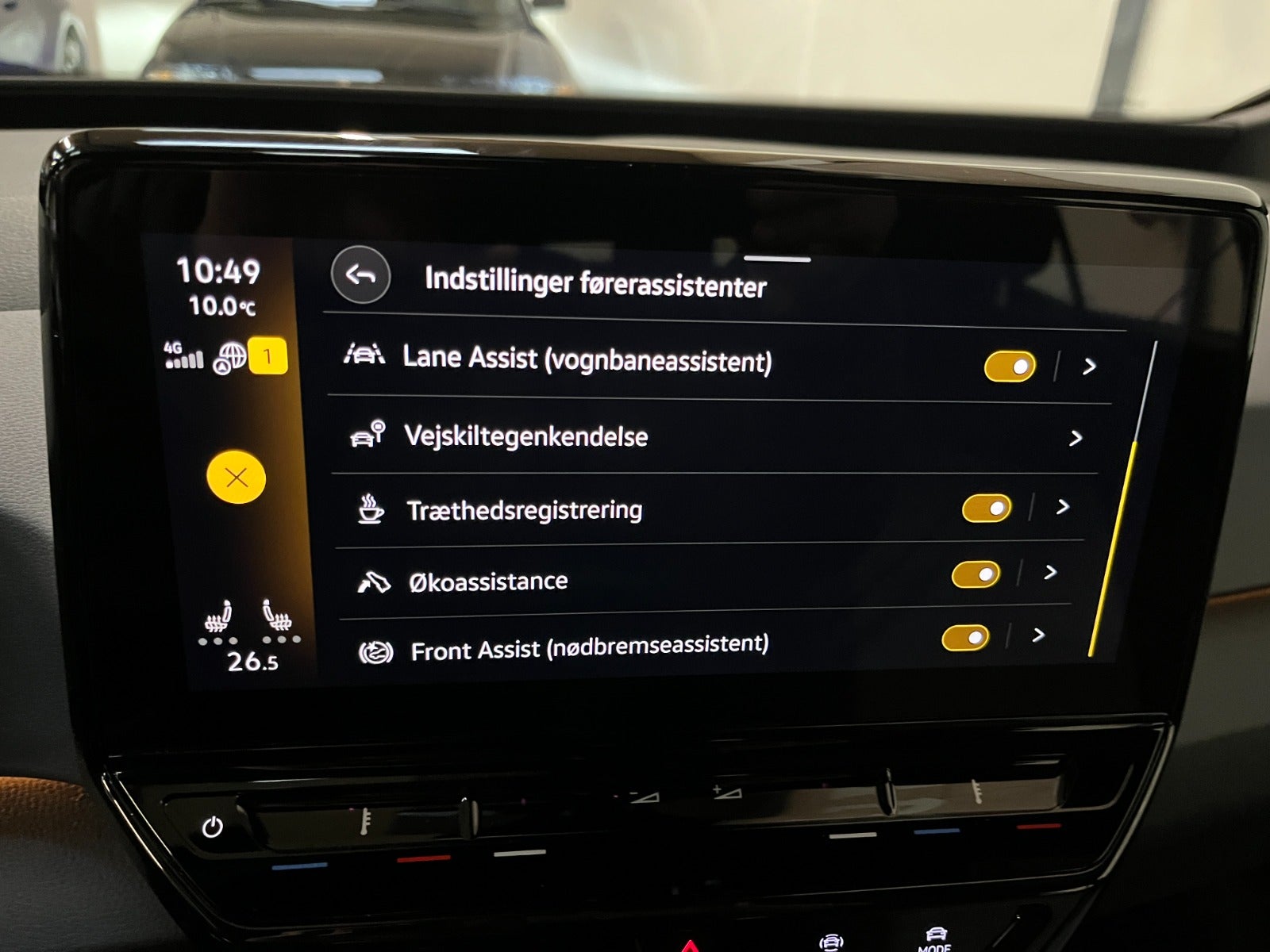 , automatisk nødbremsesystem, automatisk nødassistent, auto hold, esp, antispin, vognbaneassistent, træthedsregistrering, skiltegenkendelse, dæktryksmåler