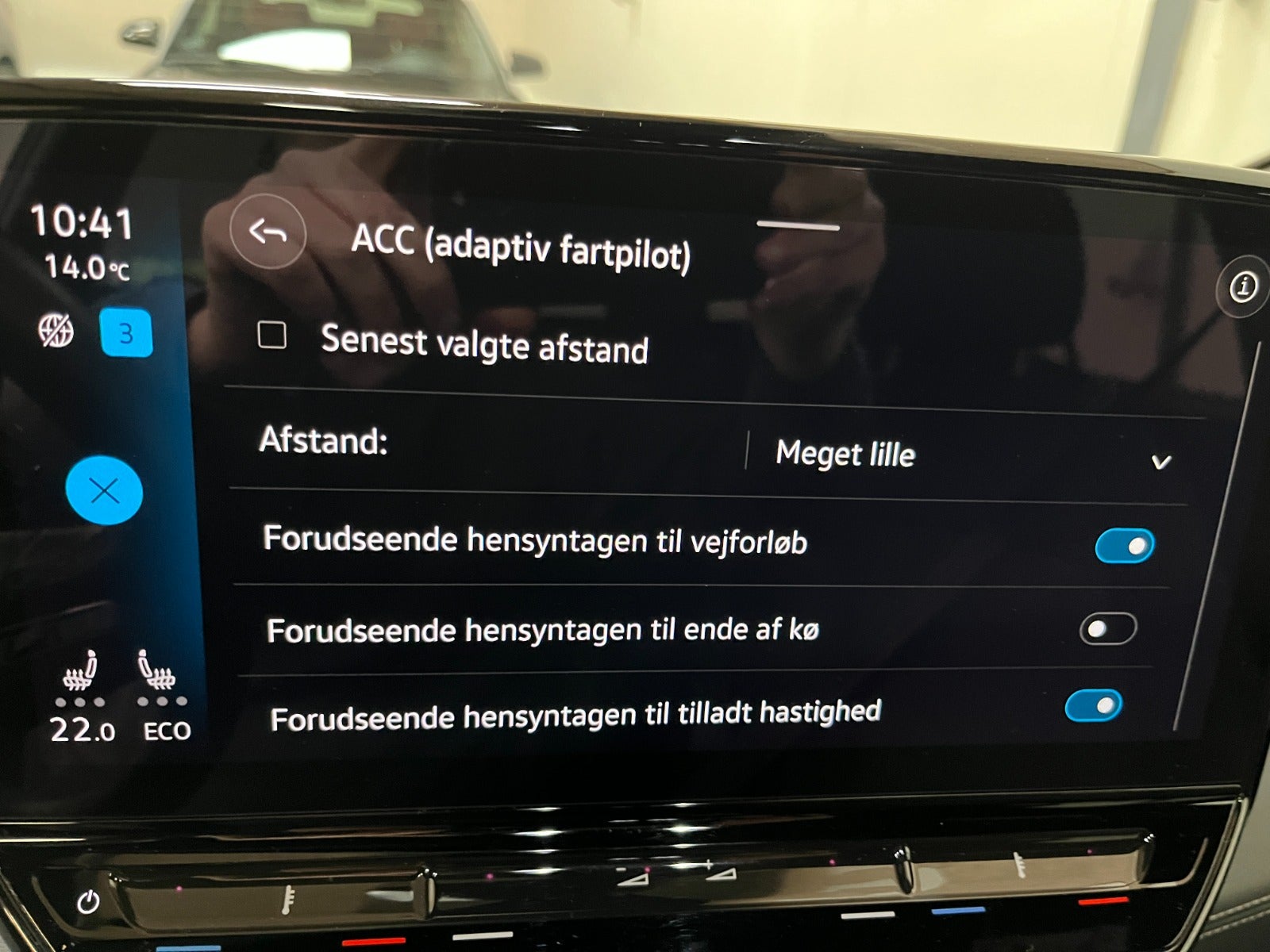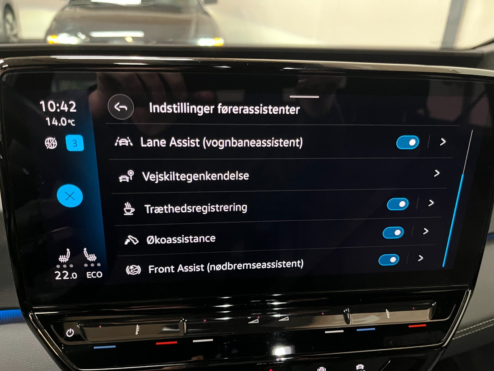 , adaptiv fartpilot, intelligent hastighedsassistent, automatisk nødbremsesystem, automatisk nødassistent, auto hold, vognbaneassistent, esp, antispin, træthedsregistrering, skiltegenkendelse, dæktryksmåler