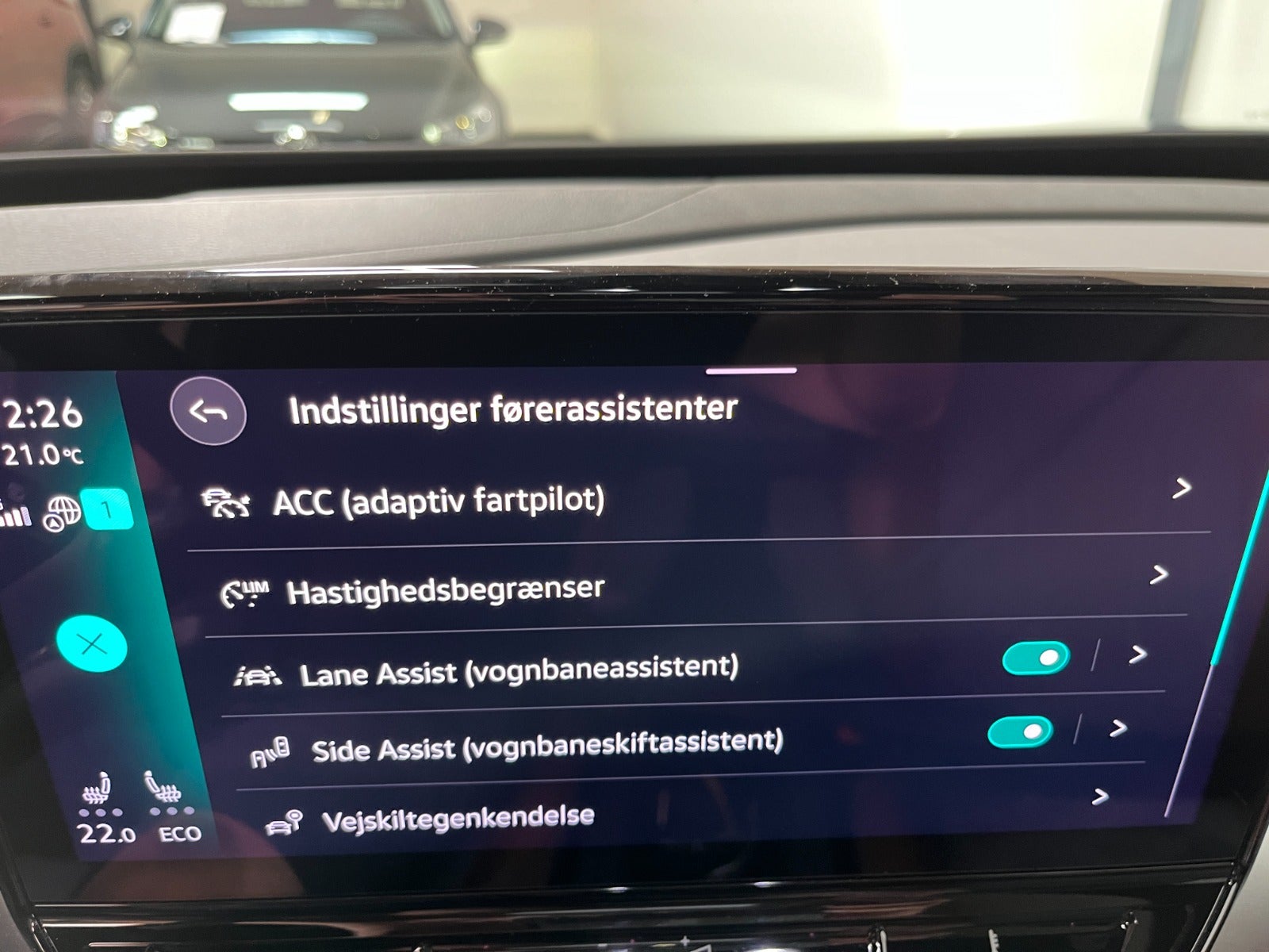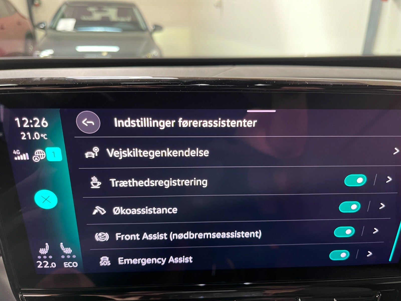 , automatisk nødbremsesystem, vognbaneassistent, automatisk nødassistent, blindvinkelsassistent, auto hold, træthedsregistrering, skiltegenkendelse, dæktryksmåler, intelligent hastighedsassistent