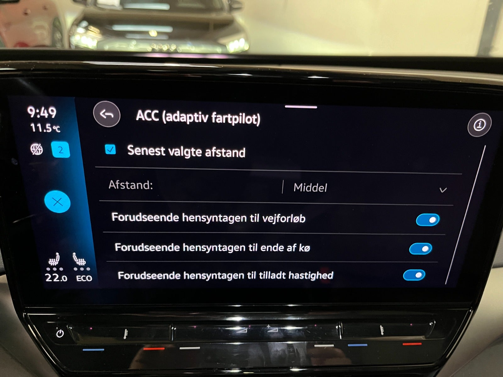 , blindvinkelsassistent, automatisk nødbremsesystem, automatisk nødassistent, auto hold, vognbaneassistent, esp, antispin, træthedsregistrering, skiltegenkendelse, dæktryksmåler