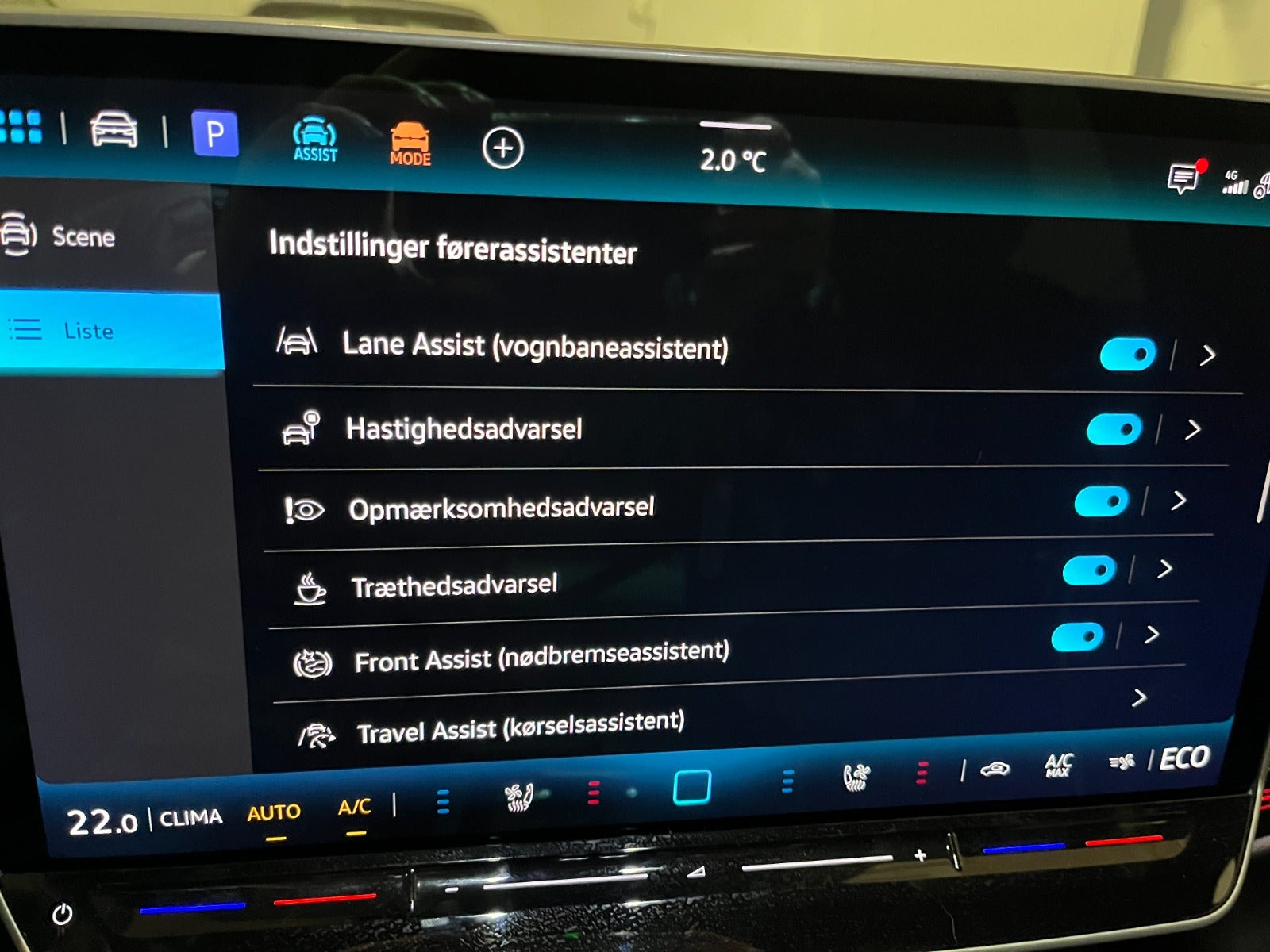 , automatisk nødassistent, auto hold, blindvinkelsassistent, vognbaneassistent, esp, træthedsregistrering, skiltegenkendelse, dæktryksmåler, automatisk nødbremsesystem
