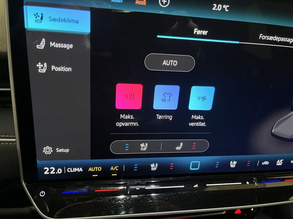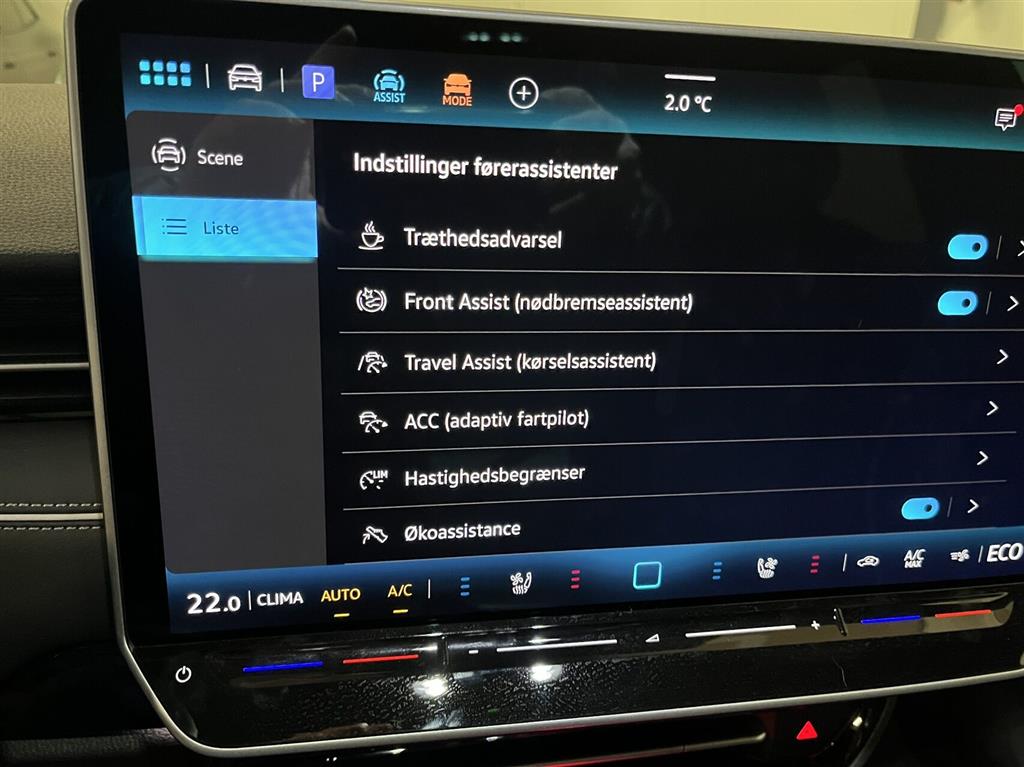 , automatisk nødassistent, auto hold, blindvinkelsassistent, vognbaneassistent, esp, træthedsregistrering, skiltegenkendelse, dæktryksmåler, automatisk nødbremsesystem